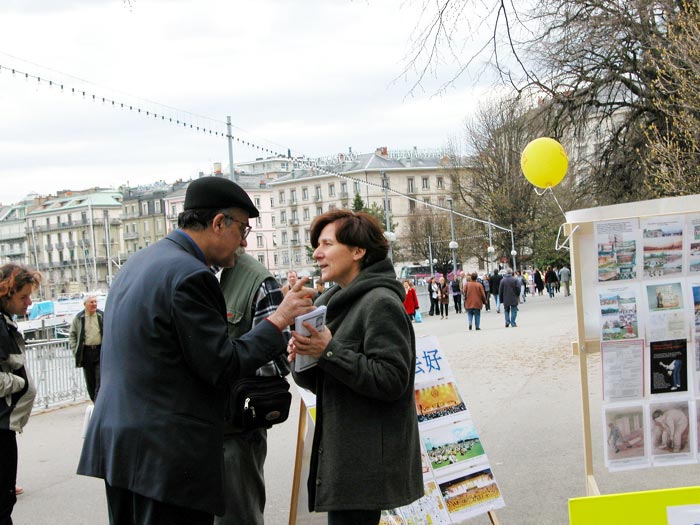 【明慧网2004年4月9日】在联合国人权会议期间,欧洲的法轮功学员周末来到了日内瓦街头向人们讲诉在中国发生的