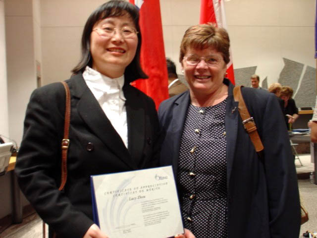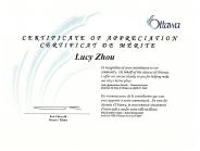 ![]() 周女士与所在选区市议员派姬-法特梅特女士(Peggy Feltmate)在颁奖仪式上合影。 | ![]() 渥太华市长签署、颁发的奖状。 |