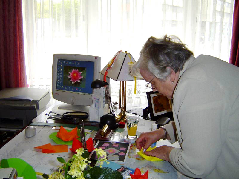 我每天都叠一些纸莲花给我的病人和其他我碰到的人,一张真象传单 + 一个纸莲花,一个微笑 + 一个发生在中国的故事……,人们就知道了真象。有时人们想和莲花合影,我就给他们寄去照片,并附上大法网址。
