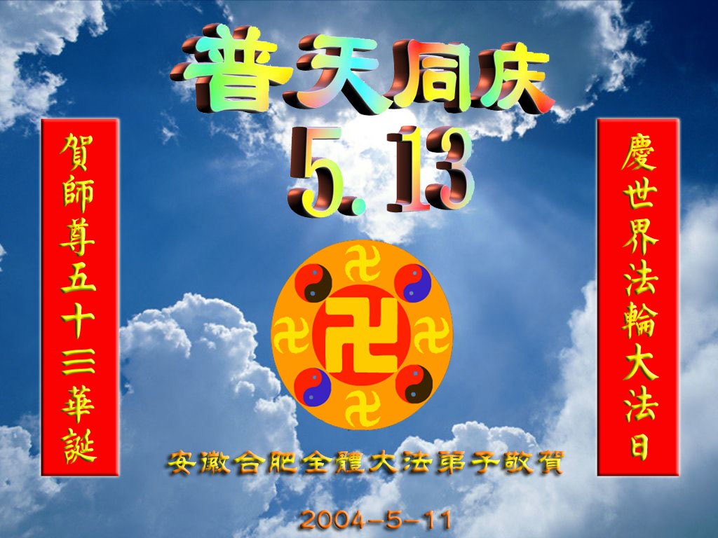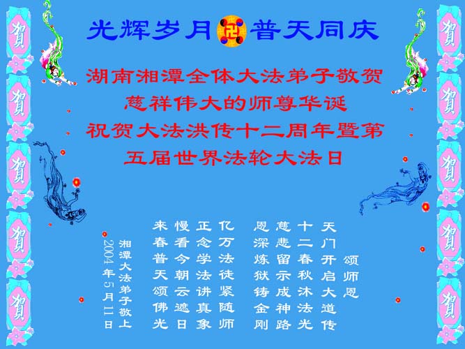 值此佳节,谨代表全体西安大法弟子恭祝慈悲伟大的师尊生日好!并祝贺法轮大法洪传十二周年!