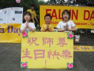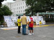 恰巧有一个从中国来的旅游团,在此逗留整个中午,学员们安静的炼功、发正念,以正念之场清除他们受到的毒害,同时有学员前去和他们交谈、讲真象,他们静静的听,并发出会意的微笑。