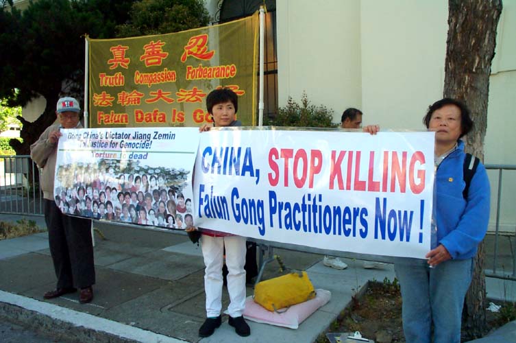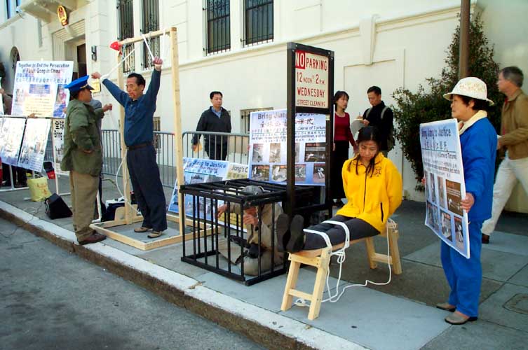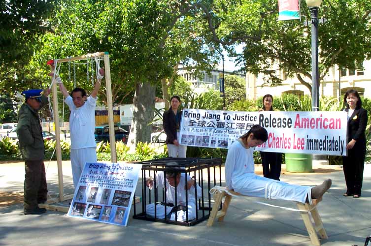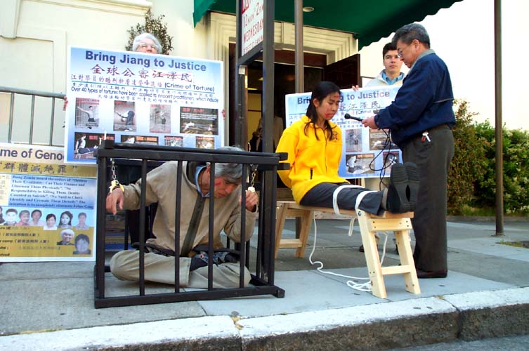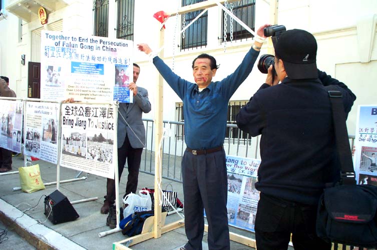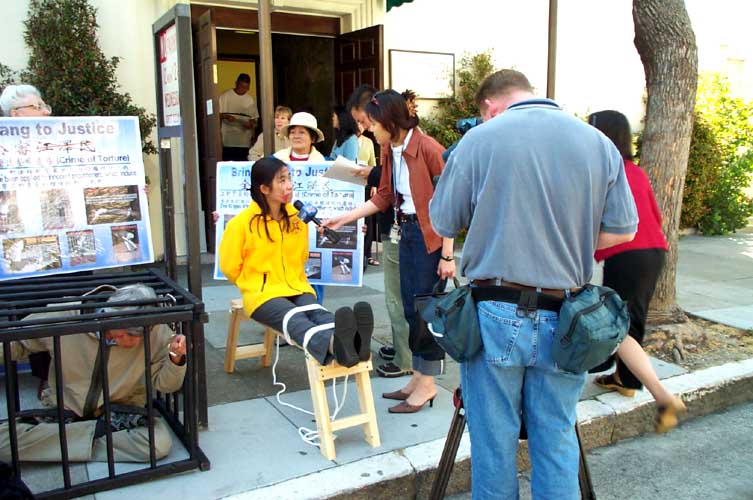 ![]() 学员在中领馆前演示在中国发生的迫害 | ![]() 旧金山KTSF电视台进行采访 | ![]() 在加州首府展示中国警察迫害法轮功学员的酷刑 |