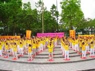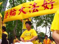 【明慧网2004年5月13日】2004年5月13日晨,香港与部分旅港大法弟子二百五十多人集体炼功洪法于百周年纪念公园,共庆第五届世界法轮大法日暨师尊传法十二周年,恭祝慈悲伟大的师尊生日快乐,并同唱同颂“法轮大法好”。