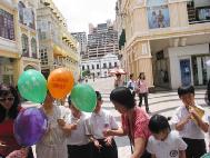 澳门法轮功学员庆祝大法洪传12周年、恭祝师父生日快乐!在这个喜庆的日子里,我们向市民派发气球、发传单,讲真象。