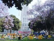 初夏的洛城阳光明媚,鲜花盛开。5月13日上午,近百名当地法轮功学员汇聚在洛杉矶市政厅南侧绿草如茵的「人权广场」,举行大炼功及新闻发布会,庆祝第五届「世界法轮大法日」。12年前,伟大慈悲的师尊开始在