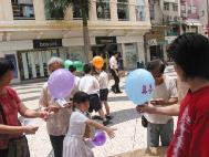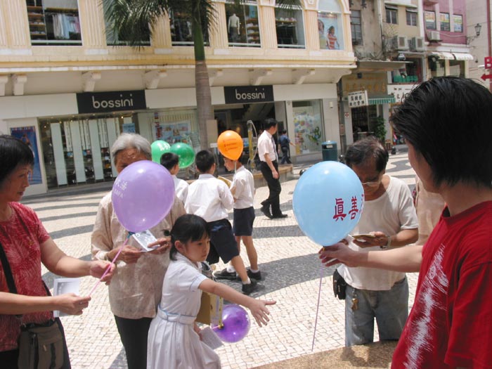 【明慧网2004年5月14日】澳门法轮功学员庆祝大法洪传12周年、恭祝师父生日快乐!在这个喜庆的日子里,我们向市民派发气球、发传单,讲真象。