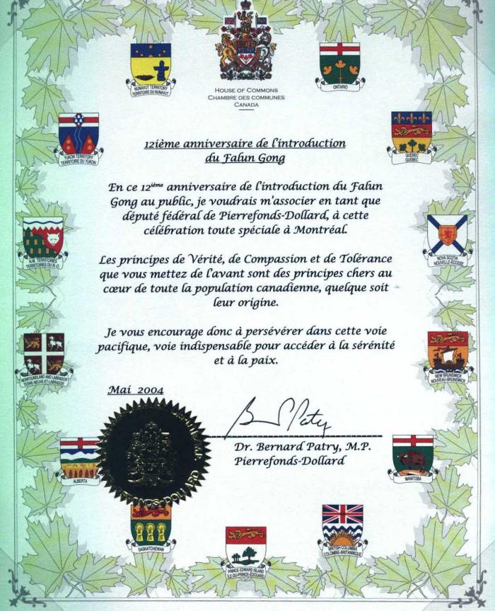 值此法轮功传于公众十二年之际,我想以皮埃尔枫-德拉市 (Pierrefonds-Dollard) [选区]联邦议员的身份参加蒙特利尔[地区]这个极为特殊的庆祝活动。