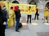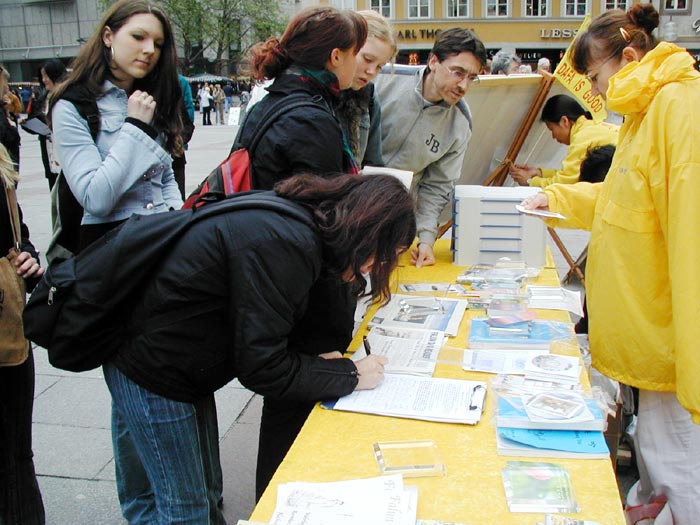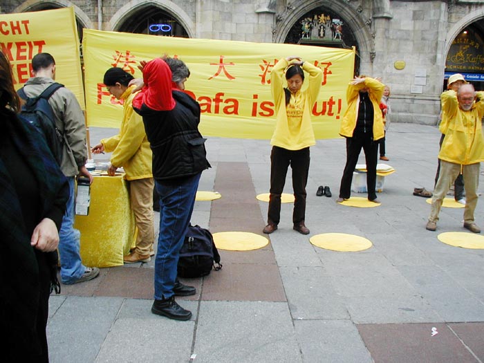 弟子们打出“法轮大法好”、“世界需要真善忍”等横幅,摆出“法轮大法洪传世界”、“正法之路”的展板,一遍遍的演练五套功法,将法轮大法的美好展现给德国民众和来自世界各地的游客。许多人观看了功法表演,并仔细的看了展板,有的人甚至还兴致勃勃的跟着学习功法,也有的人马上就到附近的书店订购一书。有不少人请大法弟子帮他们书写中文的“真善忍”和他们的名字,有的还替亲朋好友索要。当他们得知“真善忍”在中国被禁止了5年了,修真善忍的大法弟子被残酷:被洗脑、致死、关押在精神病院、被迫四处流浪、家破人亡和妻离子散时,他们简直不敢相信这是真的,许多人马上就在“法办江XX”征签表上签名。