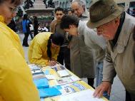 有位德国人握着学员的手说:“中国政府如此践踏人权,可是德国政府和某些政治家为了经济的利益,不顾这一现实,只顾做生意,这种做法真让人感到心寒,如果有一天我们连真善忍都保不住,那我们还能有什么!”