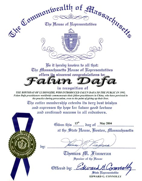【明慧网2004年5月14日】美国马萨诸塞州众议院5月13日发布公告褒奖李洪志先生和法轮大法。褒奖全文如下: