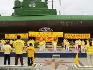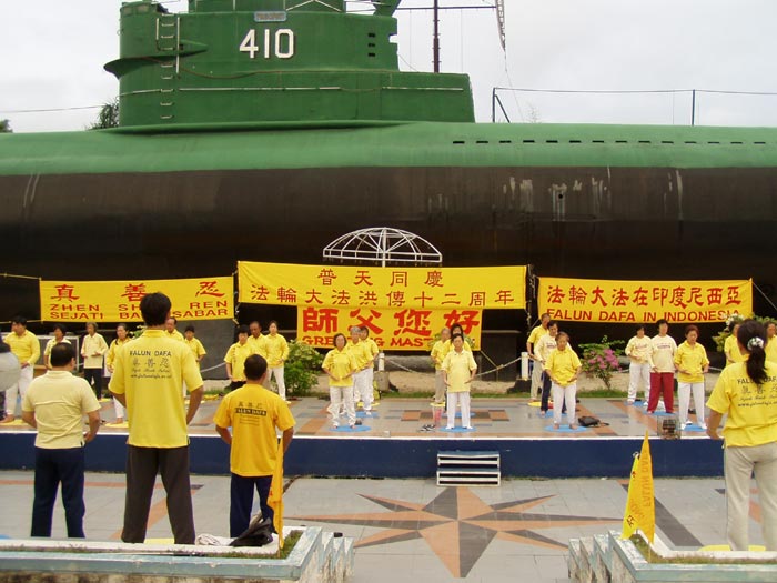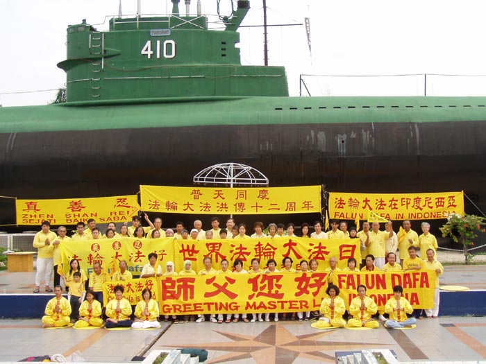 【明慧网2004年5月15日】印尼东部地区大法弟子于2004年5月13日清晨在泗水市中心的潜艇纪念馆集炼功洪法,欢庆世界法轮大法日,共贺师尊华诞。