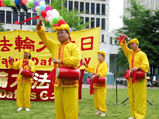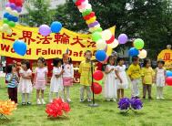 ![]() 许多人来到摆放资料的摊位前索取资料,并提问 | ![]() 明慧学校的小朋友们用稚气的童声演唱献给师父的歌 | ![]() 法轮功学员们表演腰鼓“法轮大法好” |