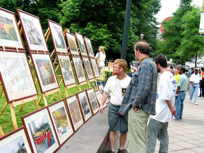 ![]() 法轮功功法表演 | ![]() 学员在派发资料 | ![]() “法轮大法正法之路”展版吸引了不少人驻足观看 |