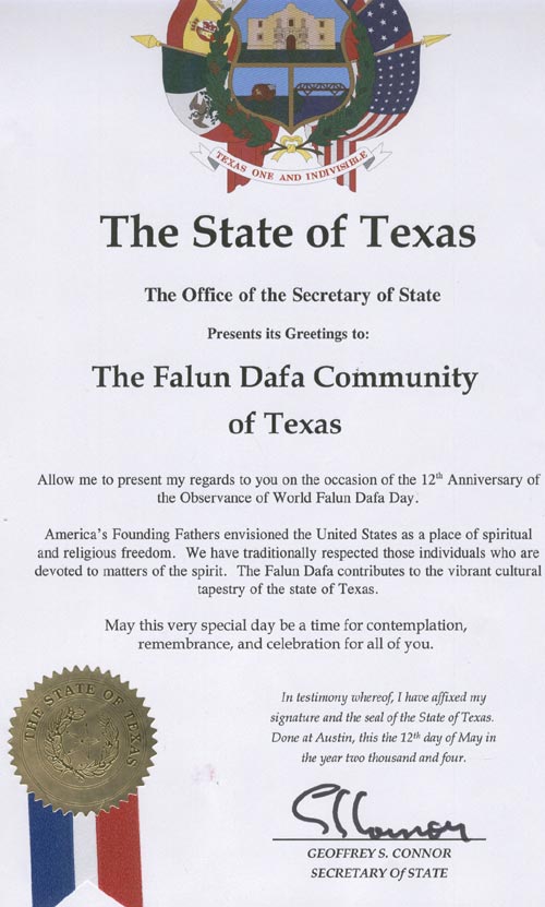 美国的奠基先辈们把美国视为一个具有精神和信仰自由的地方。尊重个人的精神信仰一直是我们的传统。法轮大法有益于德州的文化。