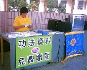 除了功法表演外,在学校走廊也布置了一个洪法的摊位。有一位妈妈因为来观看运动会而看到了法轮功摊位,很高兴的说:「我很久以前就知道也听人家说这个功法很好,但一直不知道哪里可以学,今天终于让我找到了。」她索取了很多免费的简介资料,对于学功跃跃欲试,请教了很多问题。