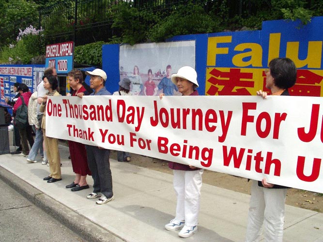 1000个日日夜夜,在固兰湖大街(Granville St.)上留下了法轮功学员不屈的身影,陪伴着太阳升起,陪伴着黑夜来临。无论刮风下雨,无论大雪纷飞,他们从没间断。