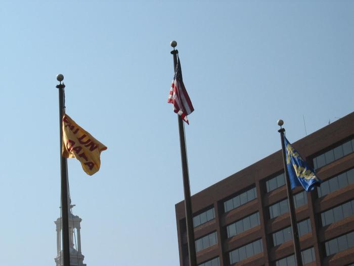 这两面旗子的升起,是特拉华州(属大费城地区)的法轮功学员们举行的庆祝法轮大法传世12周年及“世界法轮大法日”的庆祝活动的开始。