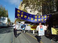 中午12时,浩浩荡荡的游行队伍从联邦广场出发。游行队伍由5个方阵组成,分别是:世界需要“真、善、忍”、大法洪传、酷刑展示、全球审江、佛光普照。