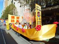 当经过一夜旅途颠簸前来参加游行的悉尼法轮功腰鼓队整齐的亮相于第一方阵时,马上吸引了来自四面八方的行人。他们和彩绸舞一同为市民们带去了中国传统文化精髓,也拉开了此次游行的帷幕。