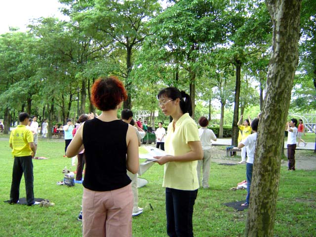 法轮功在台湾蓬勃发展,许多人因而身心受益。对照于一水之隔的大陆,坚持「真、善、忍」信仰的法轮功学员却遭到江氏集团严刑加身的残酷迫害,更多大陆同胞至今还受造谣媒体的欺骗,令人不胜感慨。「请给我一张简介!」又多一个人能明了法轮功真象了。在绿意盎然的运动公园,法轮功学员们演示五套柔和优美的功法,为午后的兰阳带来更祥和静谧的清新之美。