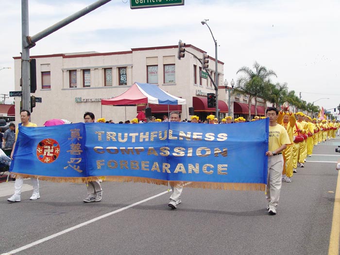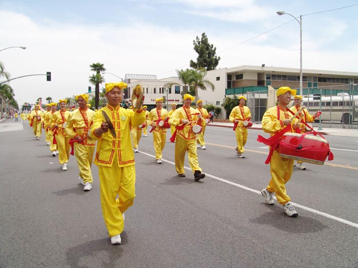 法轮功队伍被称为阵容最庞大的队伍,由仙女舞蹈队、腰鼓队和花车组成。碧天丽日之下,黄底红字的「法轮大法」、「法轮大法好」及蓝底金字的中英文「真善忍」大横幅分外醒目。翩翩起舞的仙女、威武雄壮的腰鼓,以及花车上的功法演示,把真善忍的美好带给大众。沿途的观众报以热烈的掌声、欢呼声。