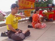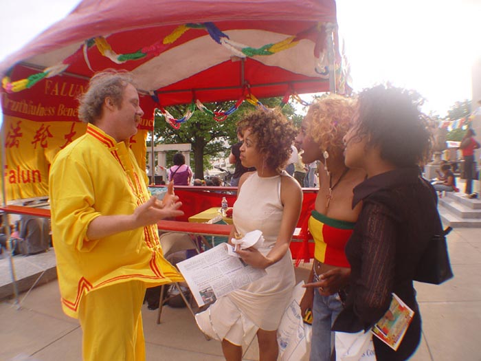 热心的参观者在辛辛那堤喷泉广场上学习法轮功