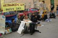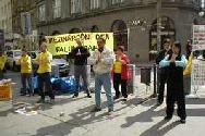 在布尔诺,学员站在繁忙的街道,人流如梭。许多人停下来了,静静地观看着功法示范。人们感谢我们将法轮功真象传单发给他们,并经常提出一些问题,问为什么法轮功在中国遭到迫害。我们告诉他们,在中国一党专政,江××非常妒忌这么多人修炼法轮功,他们听后大都接受并表示他们的理解。许多人也在请愿书上签名,表达他们反对迫害。