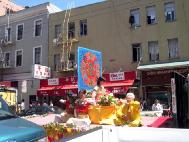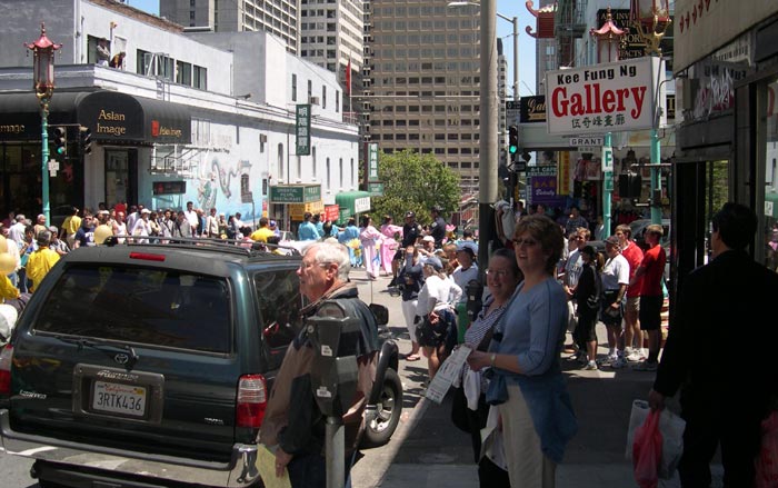 游行队伍从华盛顿公园出发,由腰鼓队开路,跟着是花车、各色唐装舞蹈队、横幅队,及旗阵队等,行進于中国城主要街道上,场面壮观。人行道上挤满了观光和购物的人群观看游行,很多人摄影录像并跟随队伍一起行進。