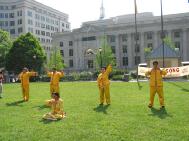 另外还有学员的发言,讲得法后的喜悦,讲迫害的真象。市民弗吉尼亚说:“我听说过法轮功。也熟悉中国[江氏]政府对炼功人的打压。这让我想起,一天早上在电视上看到的天安门广场上的流血(6.4)事件。每次想到这我都浑身发抖。
