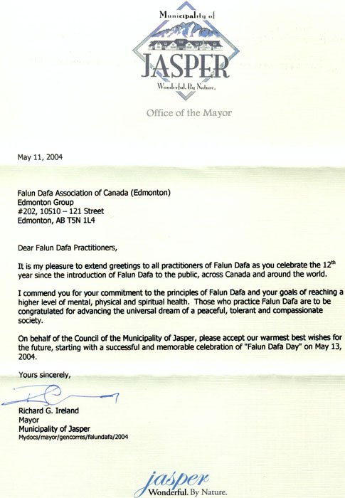 【明慧网2004年5月19日】2004年5月11日,加拿大杰斯帕尔市(Jasper)市长理查德-爱尔兰(Richard G. Ireland)致信加拿大法轮大法协会埃德蒙顿(Edmonton)分会,祝贺“世界法轮大法日”。