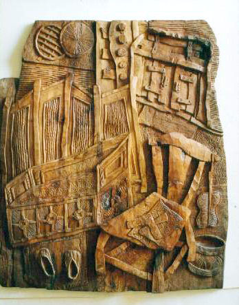 ![]() 在肖义霞的丈夫周宁指导下,一名聋哑学生的木雕作品“农家” |