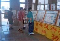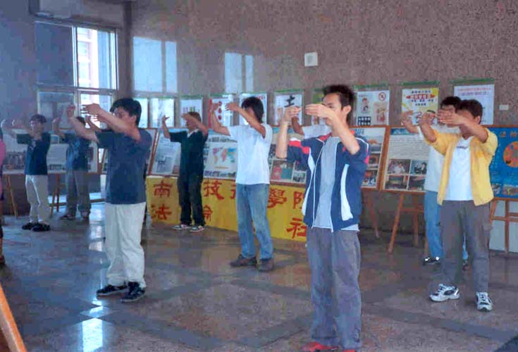 为了让夜间进修的同学也能够知道法轮功的真象,13日的图片展出特别延长至晚上八点,这些白天上班晚上来学校进修的同学,接受程度更高,有的同学接到真象资料后双手合十说“谢谢!功德无量”。有的同学说我早就知道法轮功很好。有的同学询问着要怎么学,要去哪里炼。晚上展出结束时,有一个班级的班长虽然不是法轮功学员,却带着他们班上十几个同学来帮忙将图板、图架、桌椅等用具搬上五楼存放,还说明天再来帮忙,让社团的学员大为感动。越来越多的人了解了真象,即使不修炼的人也很乐意为大法尽一份心力。