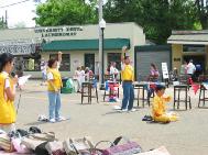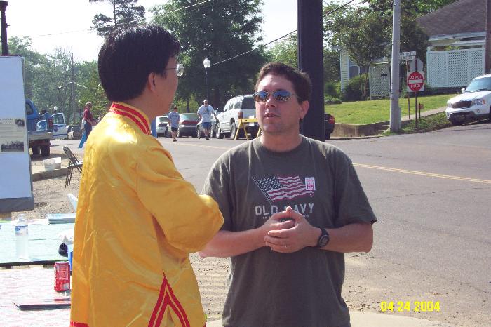 【明慧网2004年5月2日】诗城(Starkville)是个宁静美丽的美国南方小镇,密西西比州立大学即位于此。每年四月中都会有一个艺术节日,当地的法轮功学员们在接着四月三日在学校的国际节中的讲真象活动后,于四月二十四日的艺术节也设立了一个摊位,展出看板及发传单。为了不落下一个有缘人,学员背着真象资料走遍艺术节的每个角落,将真相材料送到每个摊位上,同时向遇到的游人介绍大法及讲真象。