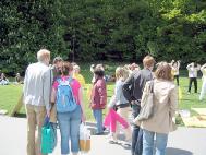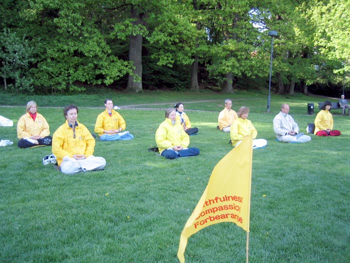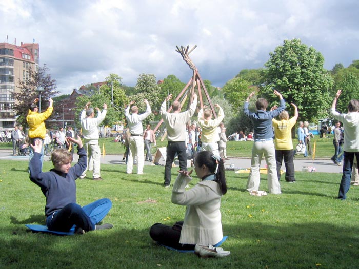 【明慧网2004年5月20日】2004年5月15日,定期的法轮功辅导班在瑞典哥德堡(Gothenburg)的斯罗司科根公园(Slottsskogen)举行,当时一年一度的哥德堡半程马拉松比赛也在那里举行。长跑比赛的起点和终点都在同一个公园里。大约三万六千名长跑者参加了比赛,有至少同样多的民众出来观看。学员们在辅导班的活动结束后,再一次为异常众多的观众演示功法。