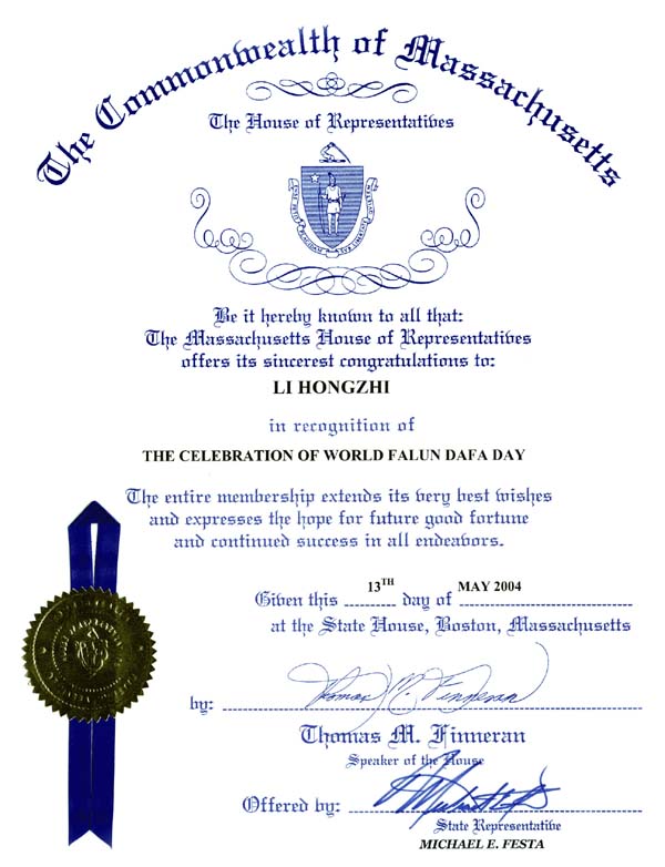 马萨诸塞州众议院向李洪志先生致以最衷心的祝贺!