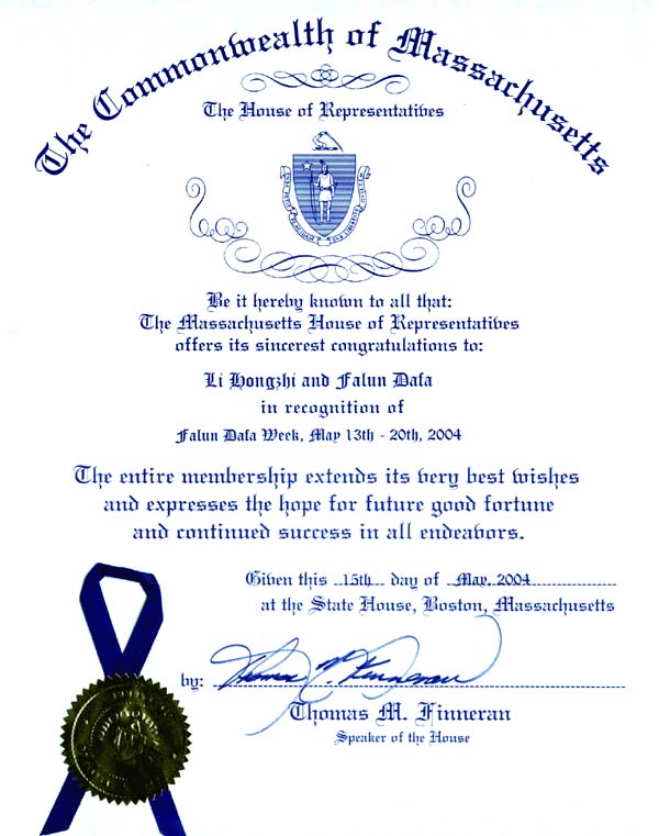 【明慧网2004年5月20日】马萨诸塞州众议院议长5月15日发布公告褒奖李洪志先生和法轮大法。褒奖全文如下: