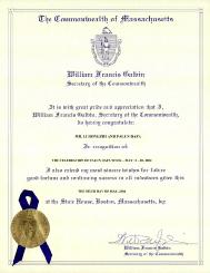 2004年5月6日于马萨诸塞州州府大楼,波士顿市签发者: 威廉-弗朗西斯-阁尔文(William Francis Galvin)麻州州务卿