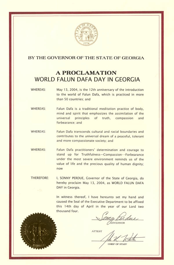 鉴此,我,乔治亚州的州长桑尼-普渡,特此宣布2004年5月13日为乔治亚州的世界法轮大法日。