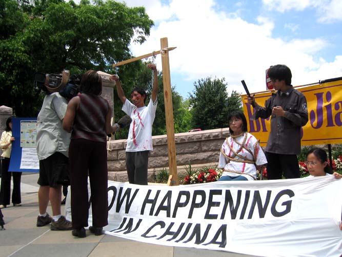 中午时分,“支持诉江汽车之旅”抵达德州的首府奥斯汀,同当地和圣安东尼奥的学员一同举行了新闻发布会,揭露江泽民对法轮功学员的惨无人道的迫害,同时,还举行了对江泽民的象征性公审,两位法轮功学员展示了中国监狱中的酷刑。