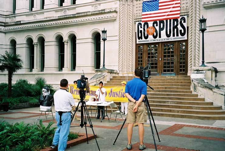 10点钟的时候,德州法轮功学员在市政厅前的小广场上做准备工作时,当地的CBS电视台就已提前10多分钟赶到,静候学员们摆展板。不久FOX当地台的记者也匆匆赶来。