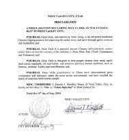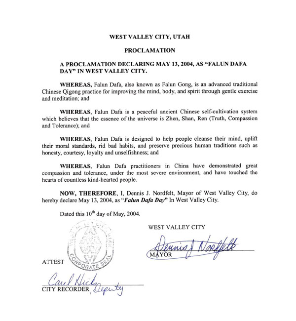 因此,现在,我,西谷市市长丹尼斯-诺德菲尔特(Dennis J. Nordfelt)在此宣布2004年5月13日为西谷市的“法轮大法日”。