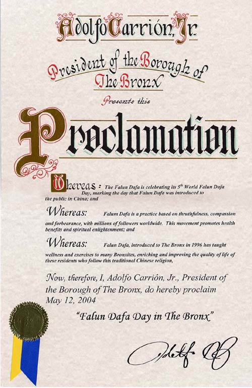 因此,现在,我,阿道夫-卡利昂(Adolfo Carrion, Jr),布朗士区区长,宣布5月12 日为“布朗士法轮大法日”。