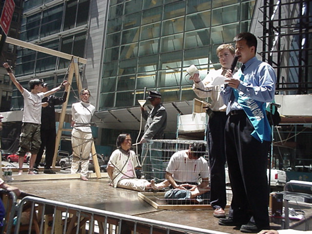 新闻发布会上模拟展示了在中国监狱为迫使法轮功学员改变信仰所施用的种种酷刑,如老虎凳,吊打,强迫灌食等。曾经在中国受过迫害的学员,以及亲人正在中国遭受迫害的学员家属讲述了他们及亲人的经历。在繁华喧闹的时代广场,酷刑展示吸引了大量来往的市民驻足围观,许多人表示震惊,并在一面展开的黄色横幅上签下自己的姓名,表示支持对江的诉讼。