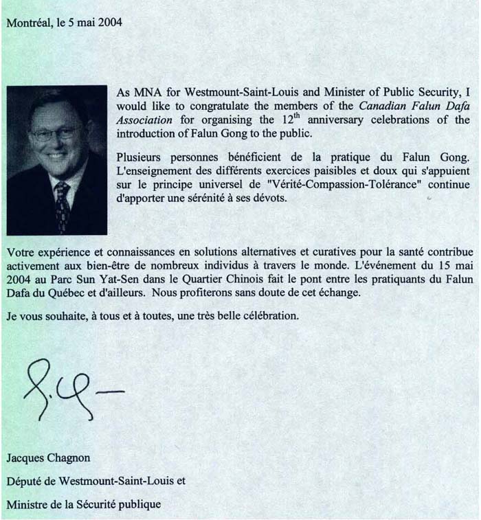他说,你们那效果显著的治疗方法和经验为改善全世界许多人的健康作出了贡献。你们2004年5月15日在唐人街中山公园里的活动将为魁北克省法轮功学员和其它地方的法轮功学员们间建立一座桥梁。我们将毫无疑问的受益于这次交流。我祝愿你们的庆祝活动成功!