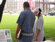 上班的法轮功学员们利用午餐的时间纷纷赶到位于市中心的肯尼迪广场,与早到的学员一起准备在草坪上准备好场景,有一些学员在向过往的人们介绍的活动的内容和目地。