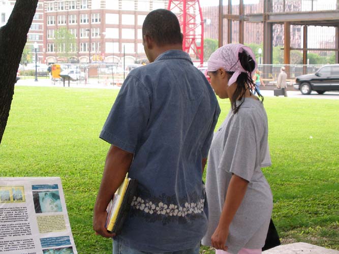 一位过往的行人问学员,在中国发生这样的残酷迫害,为什么中国人不大家齐心协力起来反对,而让这残酷的迫害发生?学员向他讲了这些受迫害的人为什么修炼法轮功,修炼法轮功使个人、家庭、社会受益,却不为妒嫉心极强和权利欲极大的江××所容,他利用他所控制的国家机器,使用一切邪恶的手段迫害修炼的人,同时他散布着谎言诬蔑法轮功,掩盖着他所做的一切,很多人并不知道或不完全知道真象。再加上在过去的历史上中国人受到××党的迫害,致使许多人不敢说真话。