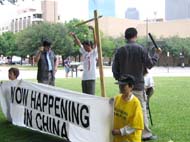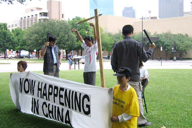 设在模拟审判庭边上的酷刑展示,由两位法轮功学员扮演正在遭受迫害的学员,他们在炎热的太阳下被绑和用手铐吊着,那场景令许多过往的人们驻足观看和询问。有的人们听说过中国镇压法轮功的事,但很模糊,也很难想象残酷到什么程度,生活在自由社会的人们哪会有这样的体验?