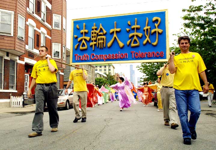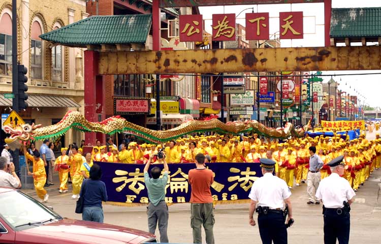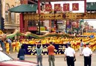 中午,千余名法轮功学员在芝加哥中国城举行了以“法轮大法好”为主题的盛大游行。