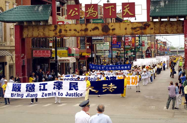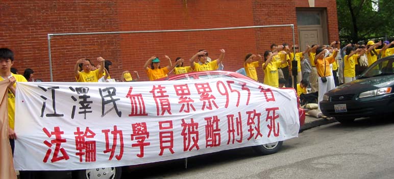 【明慧网2004年5月23日】2004年5月27日,在芝加哥的美国联邦法院第七巡回法庭上诉庭将开庭就诉江案進行法庭辩论。5月22日,来自全美及世界各地的近两千名法轮功学员汇集芝加哥,以中国城大游行和中领馆前集会为连续几日的揭露迫害,支持诉江活动拉开序幕。