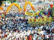 和去年一样,法轮功学员们精心制作了四个写着“法轮大法好”“世界需要真善忍”“法轮功使上亿人身心健康”以及“法轮功与你同行”的大横幅。四大迎风招展的横幅,在清晨的阳光映照下显得格外耀眼夺目。沿路上,时常听到“法轮功呀”,“法轮功好”等声音,时常还有人大声地念出“法轮大法好!”马上赢得阵阵掌声,每当此时很多学员都会从心底流出喜悦的泪花。